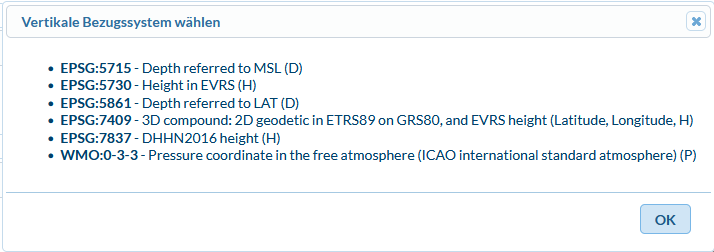 wird eine Liste mit den Höhenbezugssystemen geöffnet. Mit Ihrer Auswahl wird das Bezugssystem automatisch im Feld "Vertikales Bezugssystem" hinterlegt. - Beschreibung der vertikalen Ausdehnung der Ressource