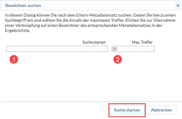 - Eingabe des Titels der gesuchten Metadatensatzes(1), Festlegung der Darstellung der maximalen Anzahl der gefundenen Treffer (2) und Suche starten