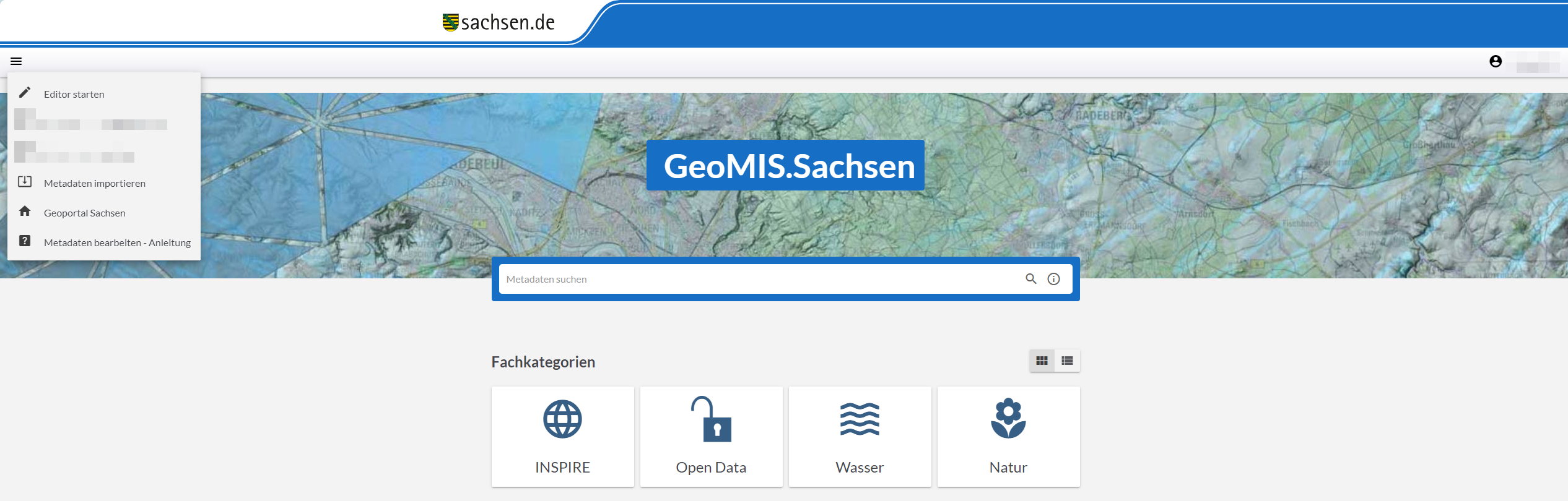 Der erste Schritt zur Erfassung von Metadaten ist der Aufruf des GeoMIS.Sachsen. Es erscheint die Begrüßungsseite des GeoMIS.Sachsen.